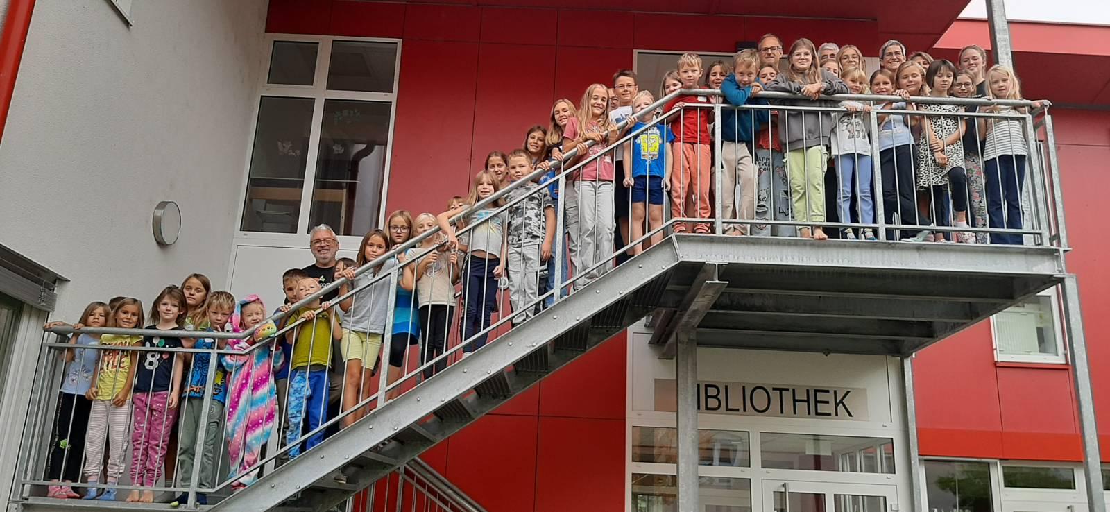 Kinder und Betreuungsteam auf der Stiege zur Bibliothek am Morgen nach der Lese- und Spielenacht